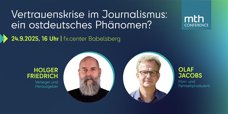Die Fachkonferenz MediaTech Hub Conference öffnet sich erstmals für ein breites Publikum. Tickets für diese Veranstaltung (12 Euro) können über den Ticketbutton unten erworben werden. Bitte beachten Sie: Mit diesem Ticket ist nur der Zugang zur Diskussion "Vertrauenskrise im Journalismus" (24.9.2025, 16-17.30 Uhr) möglich. Tickets für die gesamte Fachkonferenz müssen gesondert erworben werden.